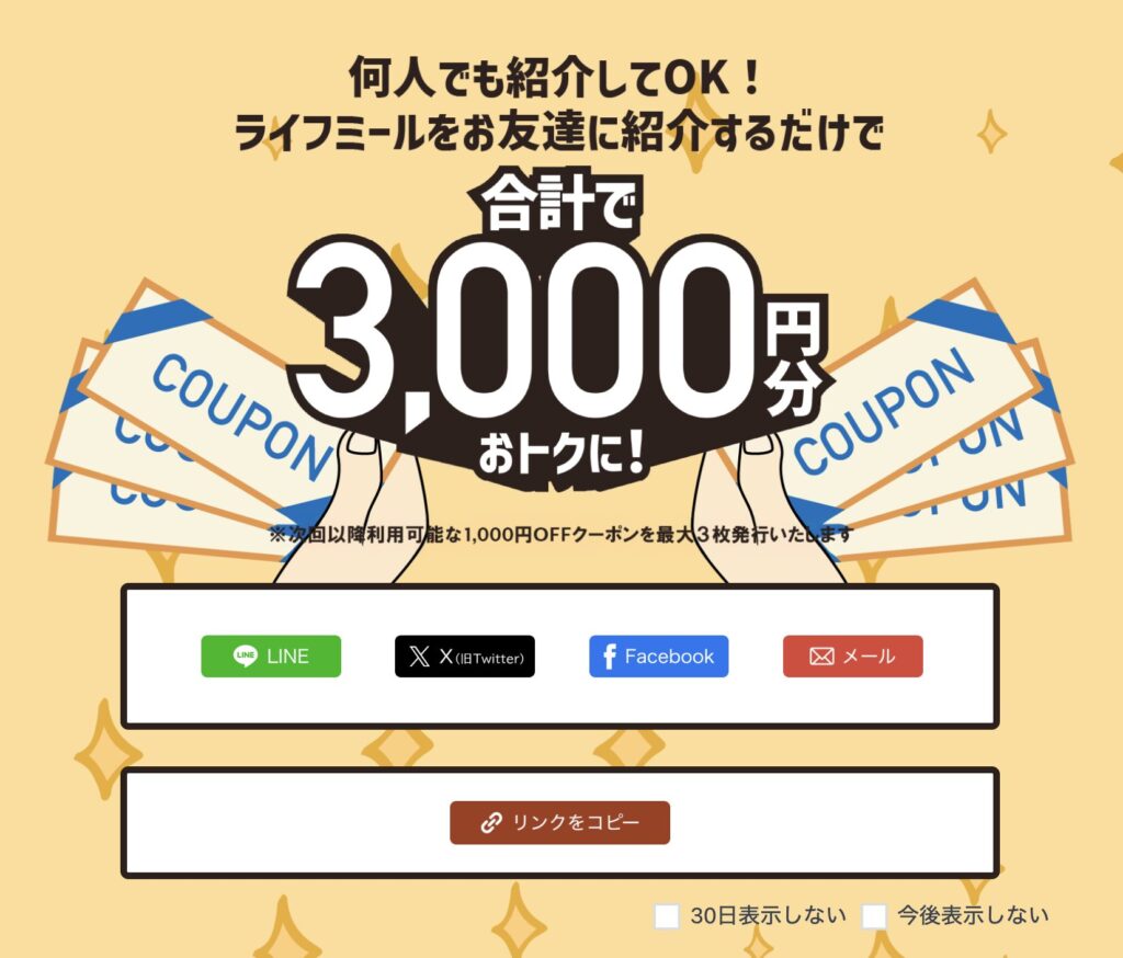 お友達から紹介リンクをもらって登録すると、最大で3回分、1,000円OFFクーポンがもらえるっていう内容。